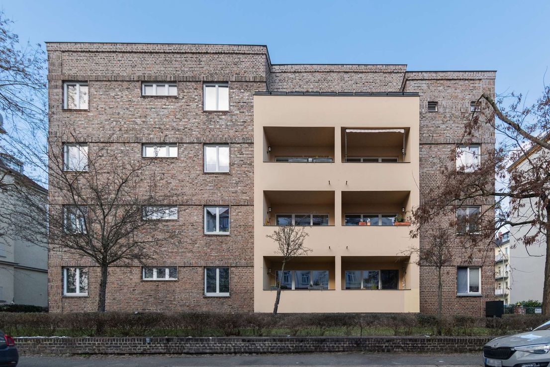 Stauffenbergstraße 8–10 was built between 1929 and 1930. The facade is mostly dark clinker brick, with horizontal bands that slightly protrude between the floors. The building has a boxy form with a flat roof and a stepped profile at the top. It is set back from the street with a small front garden. The balconies and recessed loggias are finished in simple stucco that contrasts with the brick facade.